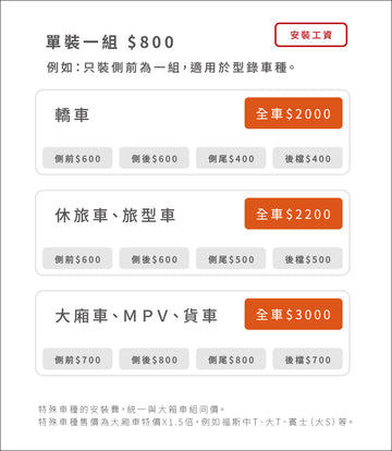 特殊車種售價為大廂車特價X1.5倍,例如福斯中T、大T、賓士(大S)等。