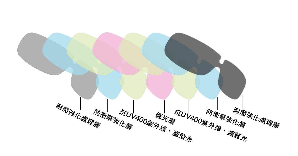 七層:包含偏光層,濾藍光抗UV400x2層,防衝擊強化層x2層,耐磨強化處理層2層