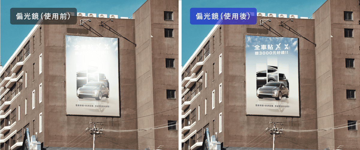 偏光鏡特性能夠降低太陽照射到物體造成的反光問題,減少日間行駛造成的反光問題。