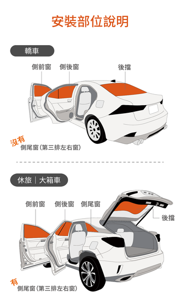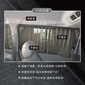 基於安全考量,窗簾做B柱往前2/3的處,若需做全滿,需要加做側前三角窗(黏魔鬼沾)。