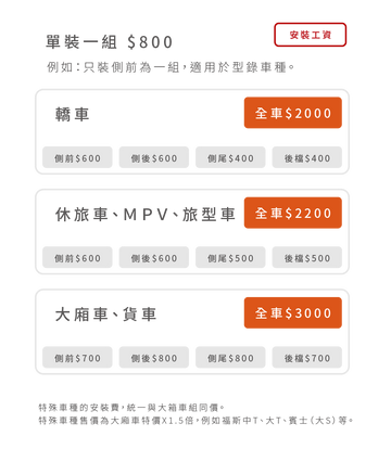 特殊車種售價為大廂車特價X1.5倍,例如福斯中T、大T、賓士(大S)等。
