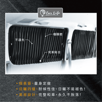 Carlife汽車窗簾使用頂級台灣材料製作,具有單向、上下伸縮特性,使用再久也不鬆垮。
